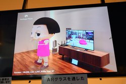 大型スクリーンを抜けると、住宅のリビングを模した展示が出現。こちらでは、ARグラスを活用したテレビの視聴スタイルが紹介されている。従来のテレビでは出演者は画面の中に映っているだけだったが、ARグラスを利用することで、出演者がテレビを飛び出すことができる。場所を移動することで、様々な角度から見ることも可能だ。デモンストレーションでは番組「チコちゃんに叱られる!」から、キャラクターの「チコちゃん」が飛び出していた。