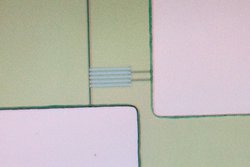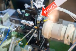 今回、微細な磁石を用いることで、電流によってON/OFF動作が行える「光変調素子(磁壁移動型光変調素子)」を設計・試作。短辺が1μmと小さいため電子顕微鏡を通して見ることになるが、実物も展示されていた。今後は、この技術を用いて、実際に表示させるデバイスを作ることが目標という。