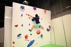 先述した3D映像を生成する技術についても展示が行われていた。ブースにはボルダリングの壁が設置され、実際に人が登っているところをモーションデータ取得用のカメラで撮影。これをPCで解析などの処理をした後、3Dデータ生成するというシステムだ。