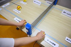 またボールの設定になっているものをそれぞれ両手で掴んでみたところ、目を閉じていてもボールがどちらのチームにあるのか、どちらのチームがアタックしたのか、ボールが地面に落ちたのかなどを直感的に感じることができた。さらに机にも振動子が設置されており、ボールが地面につくと机がリアルに振動したり、ネットは映像に合わせて揺れたりと、細かいところまで手が込んでいた。