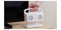 2009年の初代モデル発売以来 好評を博しているというテレビ用スピーカーをリニューアルした最新モデル。今回のリニューアルでは、使いやすさを向上。本機とテレビを光デジタルケーブルで接続するだけで使用準備が完了するほか、本体を送信機の上に置くだけで充電されるようになった(満充電まで約5時間)。