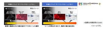 従来から引き続き、色再現・階調表現にも力を入れており、独自の色再現技術「ヘキサクロマドライブ プラス」を採用。特に有機ELテレビでは、業務用マスターモニターでも採用されている3次元カラーマネージメント回路(3D-LUT)に、有機EL専用の補正アルゴリズムを用いて進化させた「ダイナミック3D-LUT」を搭載。画面の明るさに合わせて動的に色の補正量を変化させ、暗部だけでなく明部でも階調と色彩を忠実に再現する。