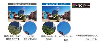 素材解像度を自動検出して適切な処理を行う「4Kリファインリマスターエンジン」も搭載した。この処理技術は、大きく分けて「部分解析処理」と「素材解像度検出」から構成。前者は、映像を部分ごとに解析して、物体ごとに最適な映像処理を行うというもの。例えば、家の壁や生け垣のような部分は質感とくっきり間を両立させ、空のような部分はノイズをクリアに処理するといった部分ごとに最適な処理を行い、高い質感とノイズレスな画質を実現するとする。