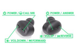左右のイヤホンそれぞれにボタンを2つずつ備えており、右側イヤホンのボタンでは通話応答/音量アップ/曲戻し、左側イヤホンのボタンではSiri呼び出し/音量ダウン/曲送りといった操作が可能。Bluetoothのバージョンは5.0。プロファイルはA2DP/AVRCP/HSP/HFP、コーデックはAAC/SBCに対応。ほか、IPX4の防水性能も備える。