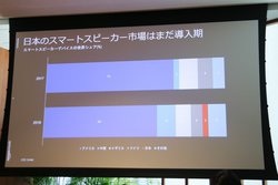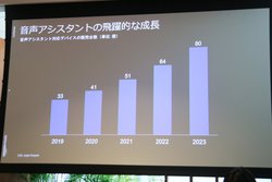スマートスピーカーやスマートフォンを含む音声アシスタント対応デバイスの販売台数は、2019年時点で33億台、2023年には80億台に達すると予測をされている。一方、2018年の日本のスマートスピーカー市場は世界シェアのわずか3%であり、「未だ導入期」であるとした。対して、サービス展開が2年以上先行したアメリカでは、2018年の世界シェアは64%となっている。