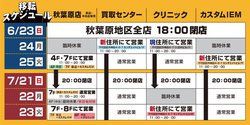 カスタムIEM店は6月24日に臨時休業を挟み、翌25日より新住所のビル7階に移転・営業開始。買取センターは6月24日より、クリニックは7月22日に臨時休憩を挟み翌23日より新住所にて営業を開始する。