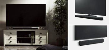 サウンドバーのボディも、薄型ラウンドフォルムを用いたデザインへ刷新。ベース部を小さく傾斜させ、両サイドを半円形にしている。表面にはファブリック素材を採用する。壁掛け時にも対応しており、その場合はテレビ台などに据え置く場合に天面にくる面が前方となる。従ってユニットの向きも変わるため、取り付け向きを自動検知して、音質チューニングも自動的に最適化される。