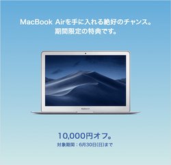 ビックカメラは、MacBook Airを1万円オフで購入できるキャンペーンをオンラインサイトのビックカメラ.comで6月30日23時59分まで実施している。
