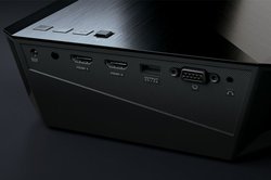 2段階フリップダウン式のスタンド機能も搭載、高さの調整も容易に行えるとのこと。入力端子はHDMI×2, D-sub 15ピン×1を装備。出力は3.5mmステレオミニジャック、USB-A端子を備えており、投影しながらUSB端子にデバイスを接続して充電(5V/2A)も可能。