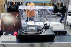 本コーナーではBluetoothスピーカーやデスクトップで使えるコンパクトなオールインワンシステム、AIスピーカーなどが揃う。アナログプレーヤーもエントリークラスを置き、ヘッドホンで試聴できるようになっていた。