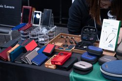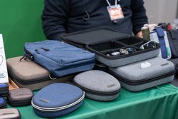 (株)カンパーニュは、自社ブランドmusashino LABELのオーディオアクセサリー類を出展。本日より発売の、取っ手付きで複数のイヤホンやDAPを収納できるセミハードケース「キャリングバッグ」や、aptX HD/aptX/AACに対応し、連続再生時間は最長約6時間のMMCXケーブル「AIR」、各社のDAPに対応するケースなどを展示している。