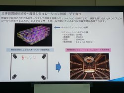 展示されていたのは、ある音に対してソフトウェア上で処理を加えて響きを加えたり、逆に残響成分を取り除いて音声を聞き取りやすくするなどといった技術。反射音や定在波による音質や明瞭性の劣化などに有効だという。