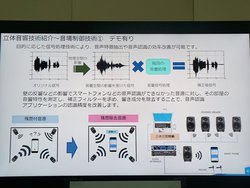 一方、残響が多くて声が聞き取りにくいような状況において、人の声をしっかり認識できるようにする音場制御技術もデモ。時間軸補正フィルターを用いて基本となる音源(声)を抽出するというもので、例えばスマートフォンの翻訳アプリで音声認識されないような場合や、音声会議システムなどで有効活用できるという。