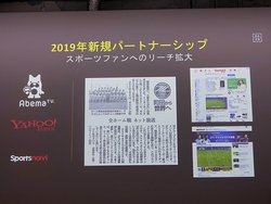 また、AbemaTVにJ2・町田ゼルビアの試合中継権をサブライセンスしたり、コパ・アメリカをYahoo! Japanおよびスポーツナビでも中継したりと、他社とのパートナーシップを拡大していることも紹介。スポーツショップのゼビオや読売新聞との提携による販売チャネルの拡大、コナミデジタルエンタテインメントのゲーム『ウイニングイレブン2019』とのコラボレーションなどにも触れ、「他の企業とのWIN-WINの取り組みを展開している。様々なパートナーシップで、多様なユーザーにあった形でスポーツを届けられる取り組みを今後も続けていく」とした。