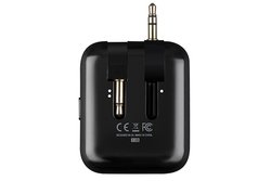 3極と2極、2種類の3.5mmプラグを備えたBluetoothトランスミッター。これにより、スマートフォンやオーディオプレーヤーなど一般的な端末はもちろん、プラグ2本で接続する航空機の機内エンターテイメントシステムの音声も入力できる。