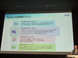 プロジェクターは、エプソンが掲げる長期ビジョン「Epson 25 長期ビジョン」の4つのイノベーションのひとつである「ビジュアルイノベーション」事業に属し、さまざまな用途に向け展開されている。今回発表されたビジネスプロジェクターは、ショップ&レストラン、教室、会議室での用途に向けたものとして紹介された。