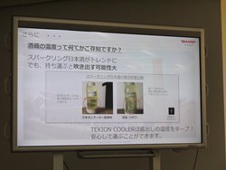 TEKION COOLERは、蓄冷材を活用して-2℃の新感覚飲料を楽しめるクーラーバッグで、9月19日より発売(オープン価格、市場想定価格は税抜5,000円前後)。蓄冷材は-24℃から+28℃で溶け始める氷の状態で蓄冷できる特長をもち、冷蔵庫に11時間入れると-11℃になる。冷蔵庫で冷やした飲み物をTEKION COOLERに入れると約30分で-2℃になり、氷点下を約2時間キープするという。「-2℃は、日本酒の酵母が活動しない温度。酵母が活性化すると入れ物から酒が吹き出してしまう状態になるが、TEKION COOLERでこれを防ぎ安定した状態にすることができる」。