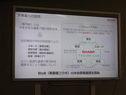 シャープではさらに、こうした独自のTEKION技術を食に限らずスポーツ、美容、医療、物流などさまざまな分野に活用し、商品化を進めていく構え。「我々の知見がない分野で、B to Bの異業種コラボを図り、本格事業展開を開始する」とし、その展開の一端も紹介された。