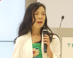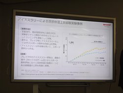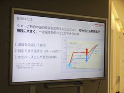 蓄冷材と新規製品について、シャープ株式会社研究開発技術本部 飲料・エネルギー技術研究所 課長 TEKION LAB CEO 兼 CTO 内海夕香氏が説明した。シャープの蓄冷材の主原料は水。「水は、氷から水にかわる時0℃を一定に保つ蓄冷材の役割を果たす。その基本特性をもとに、一定に保つ温度を変化させることで蓄冷材を開発している」。一定に保てる温度として設定できるのは-24℃から+28℃だという。