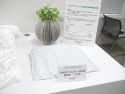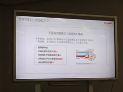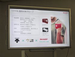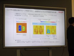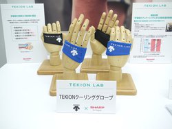 さらに、シャープとウィンゲート、およびデサントジャパン株式会社が共同開発しているのは、「TEKION 暑熱対策グローブ」。融解温度+12℃の蓄冷材が入るポケットが手のひら側についたグローブである。手のひらは特殊な熱放散構造をもち、ここを冷やすと深部体温の上昇を抑制するという。氷や保冷剤などで冷やすと温度が下がりすぎて痛みが感じられるが、シャープの蓄冷材を用いると快適な冷たさを保持できるという。
