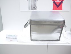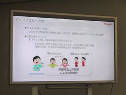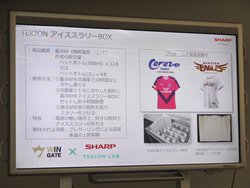 保てる温度-11℃の蓄冷材を使い、シャープとウィンゲートが共同開発しているのは「TEKION アイススラリーBOX」。アイススラリーとは、小さな氷の粒が混じったシャーベット状の飲料で、これを摂取すると深部体温の上昇を抑制し体調を維持、気分がリフレッシュし運動パフォーマンスが維持されるという。TEKION アイススラリーBOXは、アイススラリーをつくれる。-11℃の蓄冷材をセットし、ここに冷蔵庫で冷やした飲料を入れ4時間静置したのちに振れば飲料がスラリー化する。Jリーグ セレッソ大阪や、プロ野球 楽天イーグルスで実証実験中。