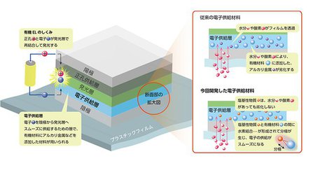 しかしフレキシブルディスプレイを実現するには、薄くて柔らかいプラスチックのフィルム上に有機ELを形成する必要がある。そしてフィルムは酸素や水分を通しやすい性質があるため、アルカリ金属が劣化してしまい、ディスプレイの十分な寿命が確保できなかった。