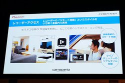 また家にあるブルーレイレコーダー内の映像コンテンツを遠隔再生できる「レコーダーアクセス」機能を新搭載。ペアリング専用アプリ「DiXiM Play for carrozzeria」をインストールしたスマートフォンと自宅のブルーレイレコーダーをペアリング、そしてスマートフォンをサイバーナビとペアリングすることで、録画番組のストリーミング再生が行える。加えて、録画番組だけでなく、自宅エリアの放送局のTV番組視聴や、BS/CS放送の視聴にも対応する。