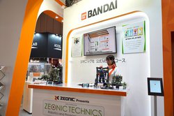 バンダイは、『機動戦士ガンダム』に登場する「ザク」を組み立てながら、ロボティクスやプログラミングについて学べる学習プログラム「ZEONIC TECHNICS」を出展。実際に学習内容の解説を行った。