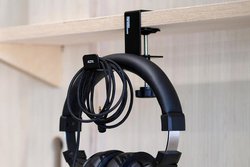 SUSPENSIONは、クランプでデスクに固定できるヘッドホンハンガー。14mmから40mmまでのデスクの厚さに対応し、ネックは360度回転する。耐久性を念頭に置いて設計した頑丈な作りだとしている。