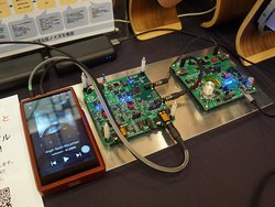 また、ポータブルアンプを開発中であることもアナウンス。まだ開発中で基板の状態での試作機の展示となったが、4.4mmと3.5mm入力、4.4mmと2.5mm出力を備え、アンバランスの入力信号に対してもバランスで出力することや、低ノイズ全作動オペアンプによるアンバランス-バランス変換を行うことなどを紹介している。