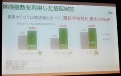昨年10月17日から1カ月にわたり行われた埼玉県内のスーパーでの実証実験では、体感指数が「非常に暑い」「猛烈に暑い」ときには、「今日は暖かいですね。青梗菜、アスパラなどの炒め物はいかがですか」と店内放送でアナウンス。体感指数が「猛烈に寒い」「非常に寒い」ときには、「今日は寒いですね。こんな日は鍋が食べたくなりますね。白菜、ブリなどはいかがですか」とアナウンスしたところ、実施店舗では比較店舗に対して青梗菜で30%増、アスパラで63%増、カブで28%増の売上増加効果が得られた。