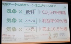 気象データの活用シーンは広がっており、配送方法を変えてCO2の54%削減を実現した飲料メーカー、値下げ時期の判断の適正化で利益率が90%増加したアパレルメーカーの例も報告されている。吉開氏は「さまざまな業態で実証実験が行われ、気象データの活用事例が増えており、社会的に意義ある取り組みだと思う。まずは食品、小売りからスタートし、今後さらに幅広い業界と話をしていきたい」と訴えた。