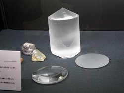 フジフイルムは、フジノンの放送用8Kレンズ群などを展示。関東平野にゴルフボール1個以下というレベルでの面精度を実現した8Kレンズ玉も展示して同社製品の質の高さをアピールしている。
