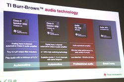 今後も「特にオーディオ市場のため、スマートホームやカーオーディオ関連も含めて、Burr-Brownの技術を生かした高品質、高音質な製品導入を考えている」とし、高性能クラスDアンプ、データ・コンバータ、オペアンプ、ADCやDACなど各製品ラインナップにおいても技術導入をしていく予定とした。