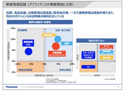 アプライアンスの事業環境について、下のような図を示す。業界において収益性、成長性ともプラスの領域にあるのは空調、食品流通、白物家電で、投資・強化すべき領域とする。一方収益性がプラスでも成長性がマイナスとなっている黒物家電については転地が必要な領域と指摘。パナソニックのポジション(図の右下)はほとんど業界と同様で、「テレビが成長性も収益性もマイナスになったために構造改革が必要なフェーズに移行した」とした。