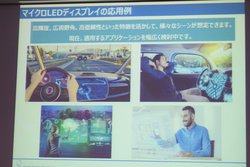 説明を行った同社R&D本部の山田一幸氏は、これらの特徴から「太陽光のような明るい外光でもはっきり表示でき、昼間の公園でスマホが見ずらいといったことがない高い輝度を実現した」と説明。高輝度を活かせる使い方として車載関連を想定するが、「今のアプリケーションだけではないと思っているので、新しいマーケットを含めて模索している」と、用途については検討中だと述べた。
