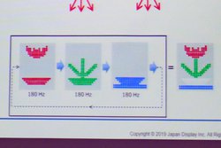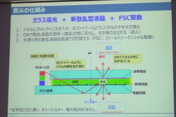 方式にはこれまでと同じフィールドシーケンシャル方式(180Hz)を採用し、2枚のガラス基板が導光板を挟むような構造となっている。下部にはRGBそれぞれのLEDが搭載されており、光ファイバーのようにパネル内部に進んだ光を、液晶で曲げて取り出すことで映像表示を行う。