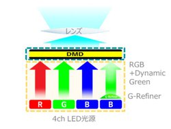従来のカラーホイール方式ではなく、R/G/B/ダイナミックグリーンを使用した「LG 4ch LED」を採用し、明るさやコントラスト、色調や残像感の少なさを追求。またカラーホイール方式と比較し、レインボーノイズを90%低減したとしている。