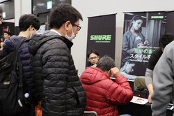 SHUREでは人気イヤホン「SEシリーズ」や、コンデンサー型イヤホン「KSE1500」「KSE1200」の試聴が本日も盛況。オリジナルグッズが当たる企画もや箱へこみ等がある製品のセール販売なども実施している。