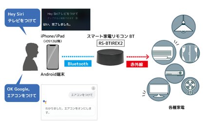 ラトックシステムは、スマホから家電を操作できるスマートリモコン「RS-BTIREX2」がGoogleアシスタントとSiriショートカットに対応し、"OK Google" または"Hey Siri" と呼びかけることで操作ができるようになったと発表した。