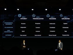 プレスカンファレンスでは、テレビにとどまらず様々な製品に搭載されているAIの進化について大きく時間を割いて言及。物事を効率化する「EFFICIENCY」、使用者個々に合わせる「PERSONALIZATION」、他のAI家電とも連携して各機器の利用状況などから推理してより最適な提案を行う「REASONING」、さらに踏み込んで実験的な学習・提案を行う「EXPLORATION」という4つのレベルがあるという考え方を示し、より高度なレベルのAI機能を追求していくとした。