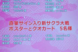 前回までのハガキによる応募方法は、今回よりLINEに変更。全2,757件の応募者の中から、「10,000円分のお買物券」(100名)と「新サクラ大戦出演キャスト直筆サイン入り新サクラ大戦B2販促ポスターと特製QUOカードのセット」(5名)の当選者を決定した。当選者にはキャンペーン事務局からメッセージが送付され、必要事項を入力した後、プレゼント商品が発送される。