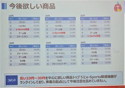 今回のアンケートでは、「今後、欲しい商品」の設問に対し、各年代でパソコンがトップに挙げられた。さらに、10代から30代では「e-Sports関連」が上位に顔を出していることに着目。「e-Sportsを突破口にして、10代・20代の若いお客様や初めて秋葉原に来るというお客様をもっと呼び込んでいきたい」と力を込めた。お客様の期待にタイムリーに応え、活気溢れる街づくりをさらに強化していく構えだ。