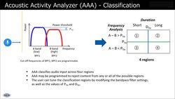 とはいえ、すべての音に反応してしまっては常に起動状態となってしまう。それを解決するのが「Acoustic Audio Analyzer(AAA)」という技術だ。AK5706では反応する音を周波数の高低/長短の4パターンで認識・設定できる機能を搭載しており、人間の声(低くて長い)、叩く音(高くて短い)など、音声の種類をある程度判別できるようになっている。