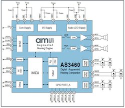 新製品群の一つとして同社は、物理的に密閉せず、ルーズに装着した完全ワイヤレスイヤホンでも、高いノイズキャンセル性能を実現するデジタルオーディオプロセッサー「AS3460」を展示している。