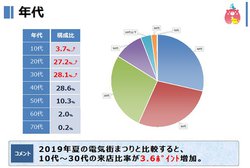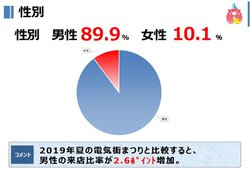 ユーザーの属性では、まず「男女比」は、「男性」が89.9%、「女性」が10.1%。秋葉原電気街振興会の加盟店には、中古を含めたパソコンや電気・電子部品などを取り扱うところが多いことが数字に反映されている。また、前回(2019年7月5日から8月12日開催「2019 夏の秋葉原電気街まつり」)との比較では、男性の比率がさらに2.6ポイントアップしている。
