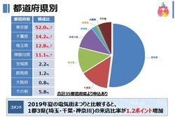 「都道府県別」では、来街者は全47都道府県のうち35都道府県に及び、筆頭は「東京都」で過半数の52.0%。次いで、「千葉県」14.2%、「埼玉県」12.8%、「神奈川県」11.1%となり、1都3県で9割を占め、前回との比較では1.2ポイントの増加を示す。なお、当選者にプレゼント商品を発送する関係から、海外は対象外となっている。