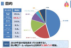 「来店した目的」では、「買い物/家電」45.4%、「買い物/ゲーム・e-Sports」19.3%、「買い物・アニメ」14.9%と続く。「買い物/ゲーム・e-Sports」が前回より3.5ポイント増加した点が目に付く。また、買い物目的はもちろんのこと、「イベント・アミューズメント」が3.8%、ラーメン激戦区で知られるなど「食事」も1.2%となった。