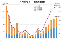オーディオレコードのうち、アナログレコード(アナログディスク)は前年比103%の21億5千万円、数量では前年比109%の122万枚を記録。これは6年連続の増加だという。