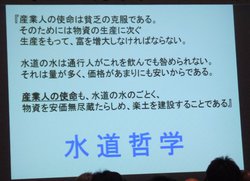 松下幸之助氏は昭和4年に経営理念を設定。「綱領 営利と社会正義の調和に念慮し、国家産業の発達を図り、社会生活の改善と向上を期す」(商売人ゆえにモノをつくって儲けることは大事だが、自分さえよければいいのではなく、社会の秩序を守り正しく儲けていく。それが国家産業の発達につながり、お客様の生活向上にも役立つ)。昭和7年には松下電器の “真の使命” を披露。「産業人の使命は貧乏の克服である。そのためには物資の生産に次ぐ生産をもって、富を増大しなければならない。水道の水は通行人がこれを飲んでも咎められない。それは量が多く、価格があまりにも安いからである。産業人の使命も、水道の水のごとく、物資を安価無尽蔵たらしめ、楽土を建設することである」。これは「水道哲学」と言われている。